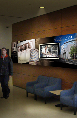 Companies with a long tradition of service often like to acknowledge their beginnings, their people, their culture and their history, especially in important public spaces such as entry foyers. Rather than a boring brass plaque, a much more engaging idea is to create a fascinating 'history wall'. This can be designed to incorporate photographs alone, or a combination of moving images, graphics and photos. Art Strategies Australia can research, design, produce and install engaging, personalised History Walls to suit most budgets.